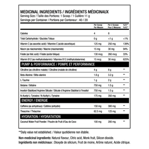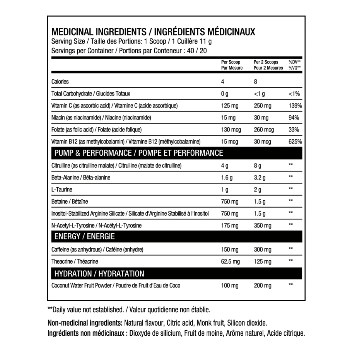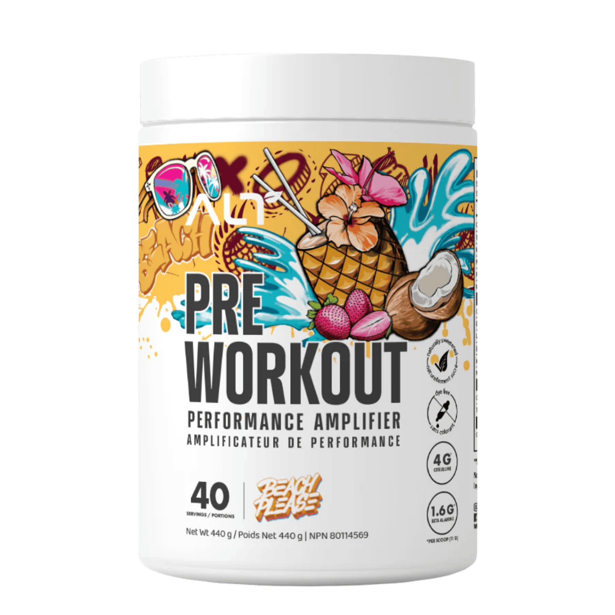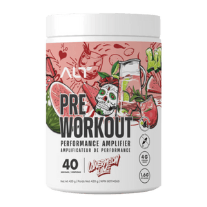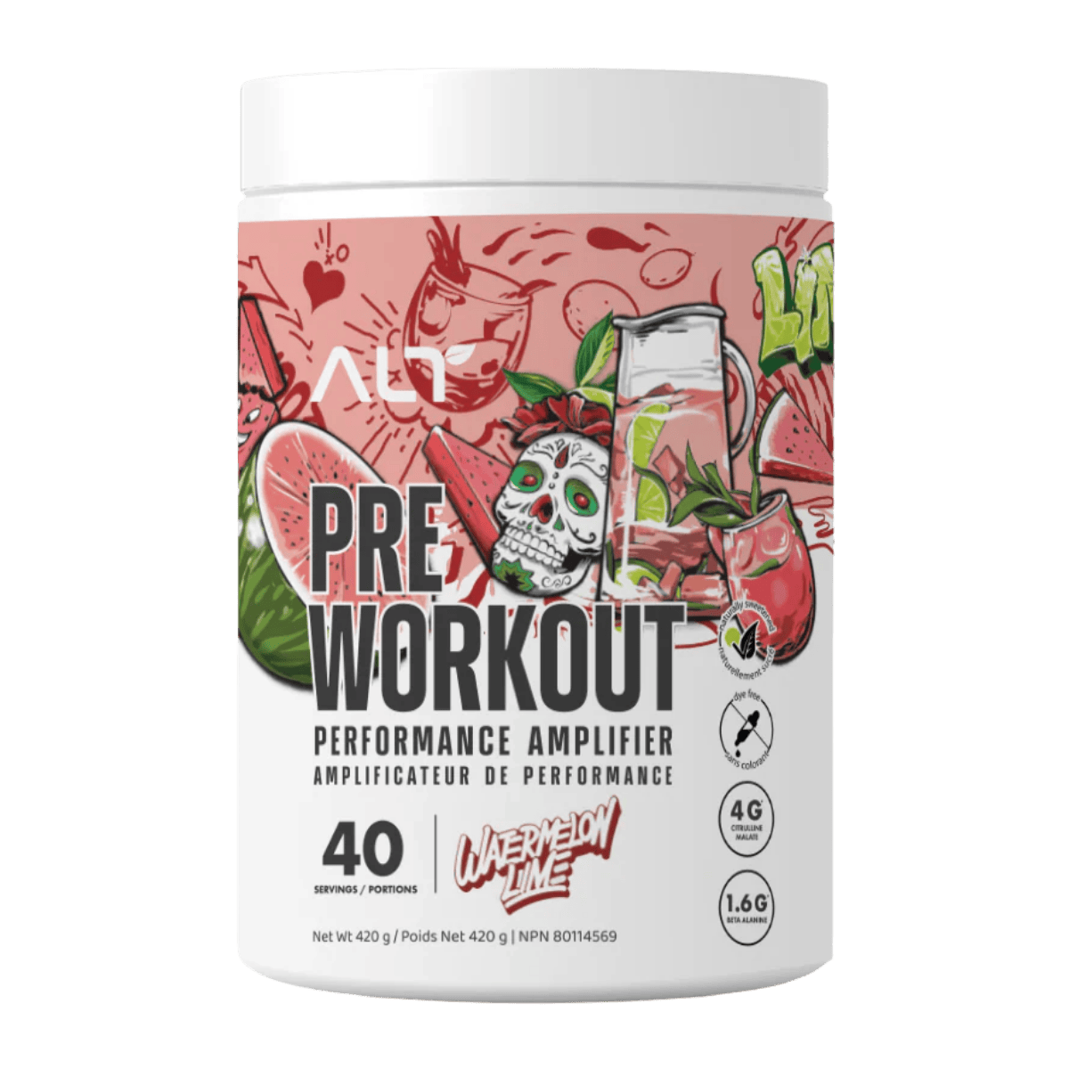 ALT Pre-Workout Performance Amplifier is a clean-label pre-workout designed to support energy, focus, pumps, and endurance before training. Each full serving (2 scoops) provides 8 g citrulline (as citrulline malate), 3.2 g beta-alanine, and 300 mg caffeine, plus theacrine for longer-lasting stimulation support. It also includes betaine, taurine, and inositol-stabilized arginine silicate for performance support, and coconut water fruit powder for hydration support. Naturally flavoured and sweetened with monk fruit, it’s made to deliver performance without artificial sweeteners or dyes.