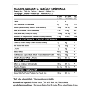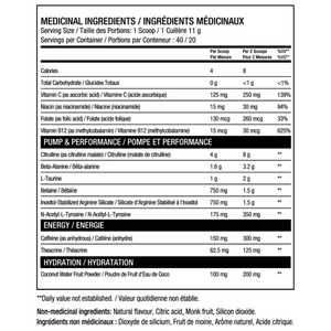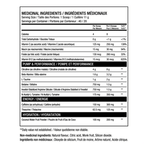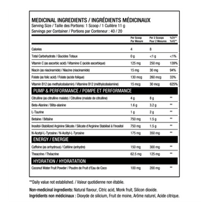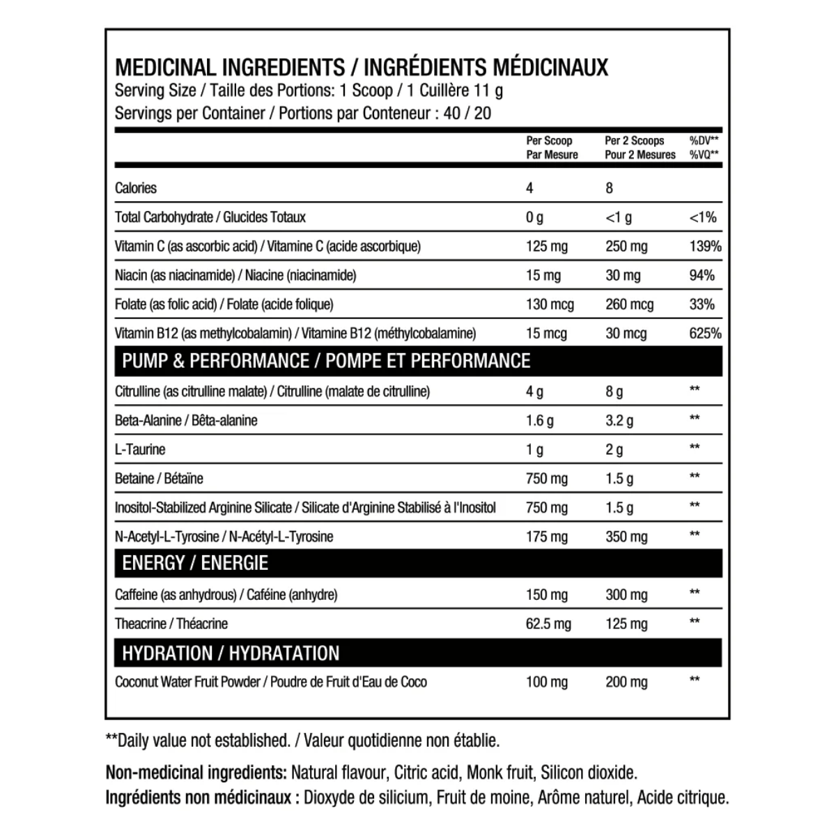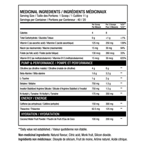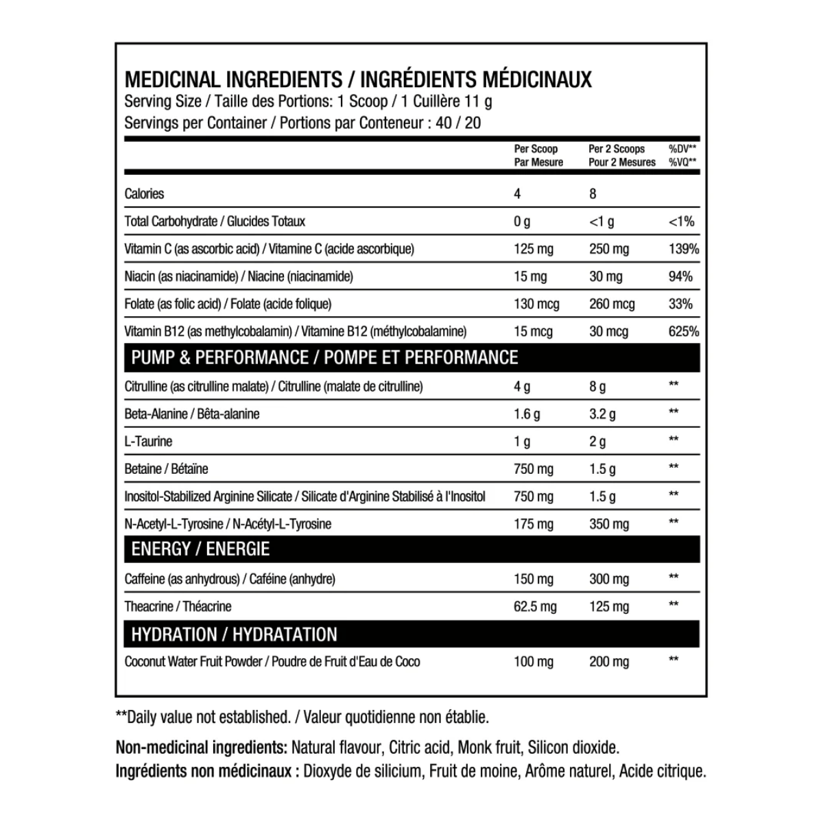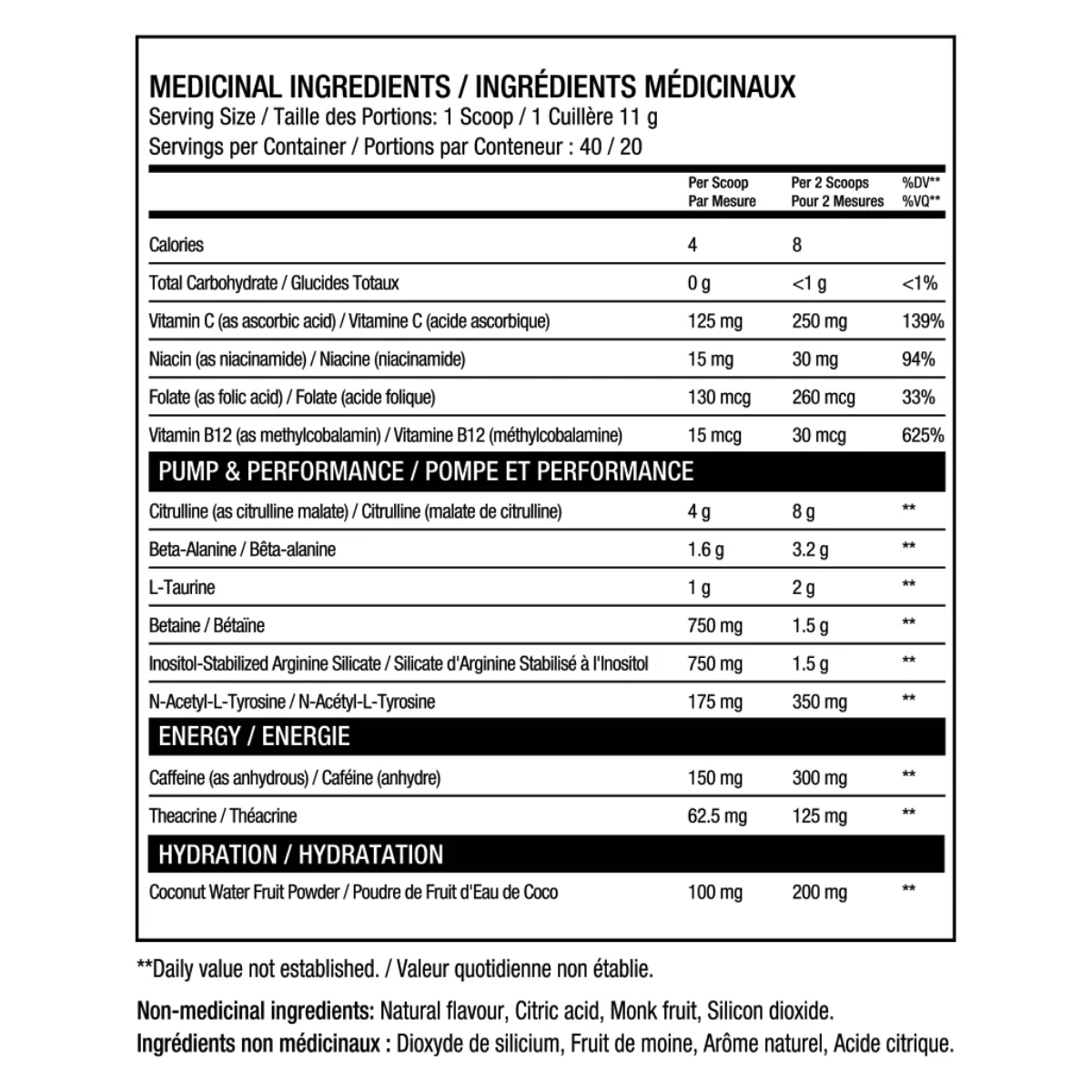 ALT Pre-Workout Performance Amplifier is a clean-label pre-workout designed to support energy, focus, pumps, and endurance before training. Each full serving (2 scoops) provides 8 g citrulline (as citrulline malate), 3.2 g beta-alanine, and 300 mg caffeine, plus theacrine for longer-lasting stimulation support. It also includes betaine, taurine, and inositol-stabilized arginine silicate for performance support, and coconut water fruit powder for hydration support. Naturally flavoured and sweetened with monk fruit, it’s made to deliver performance without artificial sweeteners or dyes.