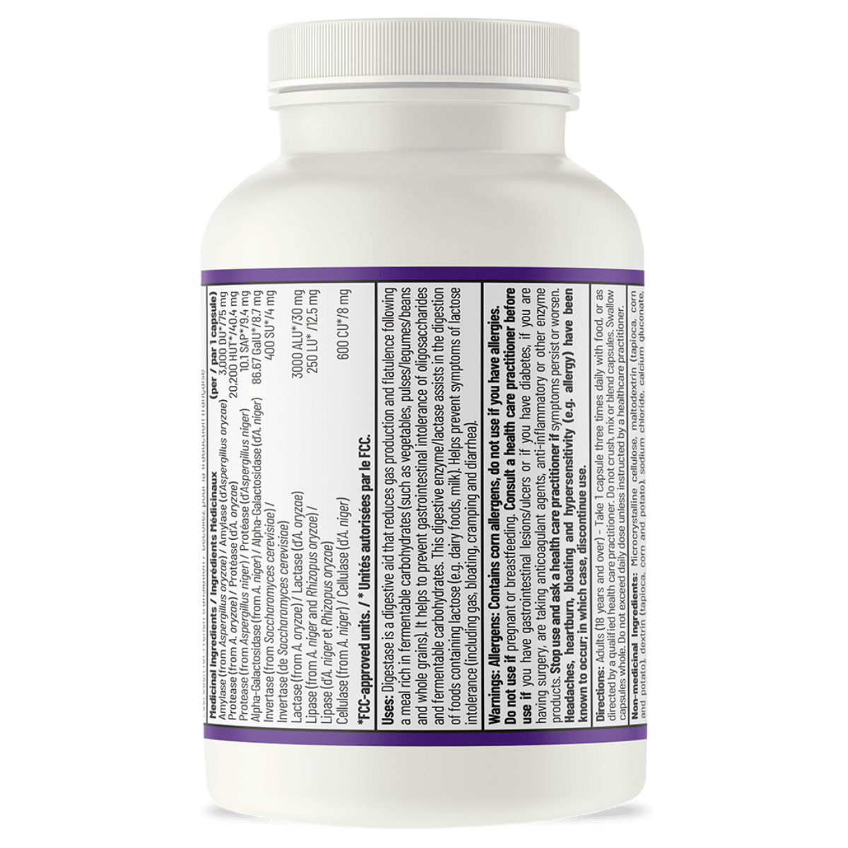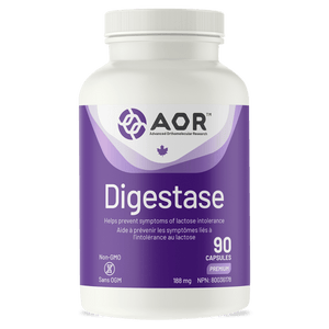 AOR Digestase is a research-based digestive enzyme formula designed to support comfortable digestion when meals feel heavy or harder to break down. Each capsule provides seven plant-based enzymes to help digest protein, fats, starches, fibre, legumes, sucrose, and lactose. It includes amylase for carbohydrate digestion, proteases for protein breakdown, and lipase for fat digestion, plus cellulase to help with plant fibres. Digestase also includes alpha-galactosidase, which can help break down fermentable carbs found in beans and legumes that often contribute to gas and bloating. For dairy sensitivity, the added lactase supports lactose digestion and may help prevent digestive symptoms of lactose intolerance when taken with food. This formula is vegan, and is commonly chosen by people who want broad-spectrum enzyme coverage with meals. Use it as a simple way to support nutrient breakdown and absorption, especially when your digestion feels sluggish or easily irritated. Take it with meals for best results, and adjust timing based on your routine or practitioner guidance.