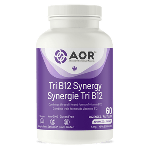 AOR Tri B12 Synergy is a high-potency vitamin B12 lozenge designed for fast, convenient daily support. It combines three bioactive forms—methylcobalamin, hydroxocobalamin, and adenosylcobalamin—to provide broad, complementary B12 activity in the body. Each lozenge delivers 5 mg of vitamin B12 and is meant to dissolve under the tongue, making it an easy option for people who prefer lozenges over capsules. Vitamin B12 is essential for healthy red blood cell formation, DNA synthesis, and nervous system function, which is why consistent intake matters—especially for those at higher risk of low B12. This formula is commonly used to help support energy metabolism and day-to-day vitality when B12 intake or absorption may be suboptimal. It also supports cognitive and neurological health, since B12 plays a role in myelin and nerve function. B12 is also involved in homocysteine metabolism, an important pathway linked to cardiovascular health markers. With a vegan, non-GMO, and gluten-free profile, Tri B12 Synergy fits well into many dietary preferences while focusing on simple, targeted B12 support.