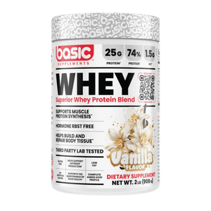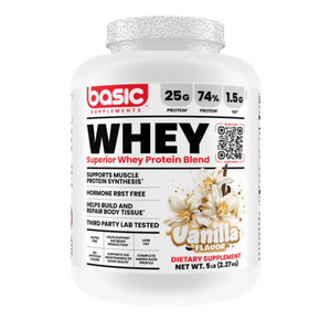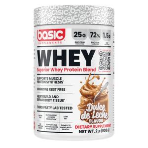 Basic Supplements Whey Protein Blend is a convenient, high-quality whey powder designed to help you hit your daily protein goals for strength, recovery, and lean muscle support. Each scoop delivers 25 g of protein, using a blend of whey protein concentrate, isolate, and hydrolysate for a balanced mix of fast and steady-digesting proteins. Naturally occurring amino acids (including BCAAs) support muscle repair after training and help maintain muscle mass during busy or calorie-controlled phases. It mixes smoothly into water or milk and also works well in smoothies, oats, yogurt bowls, and baking. Many flavours are available, so you can choose the taste you like without changing your routine. This formula is gluten-free, low in fat, and designed for everyday athletes who want a straightforward whey option.