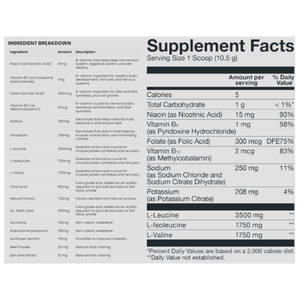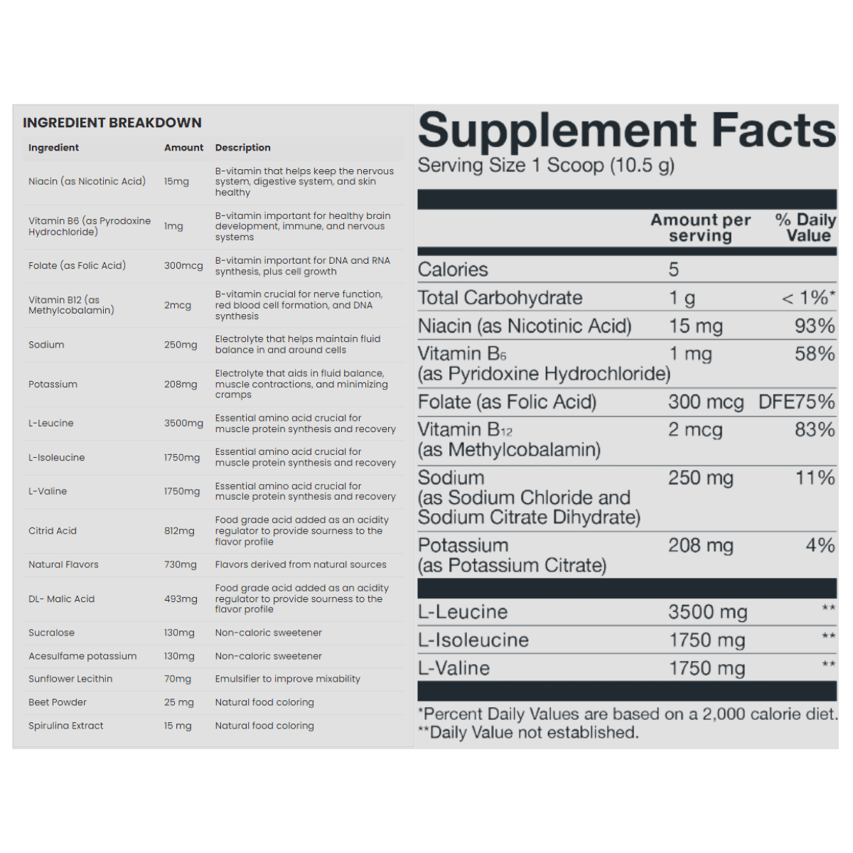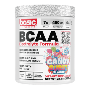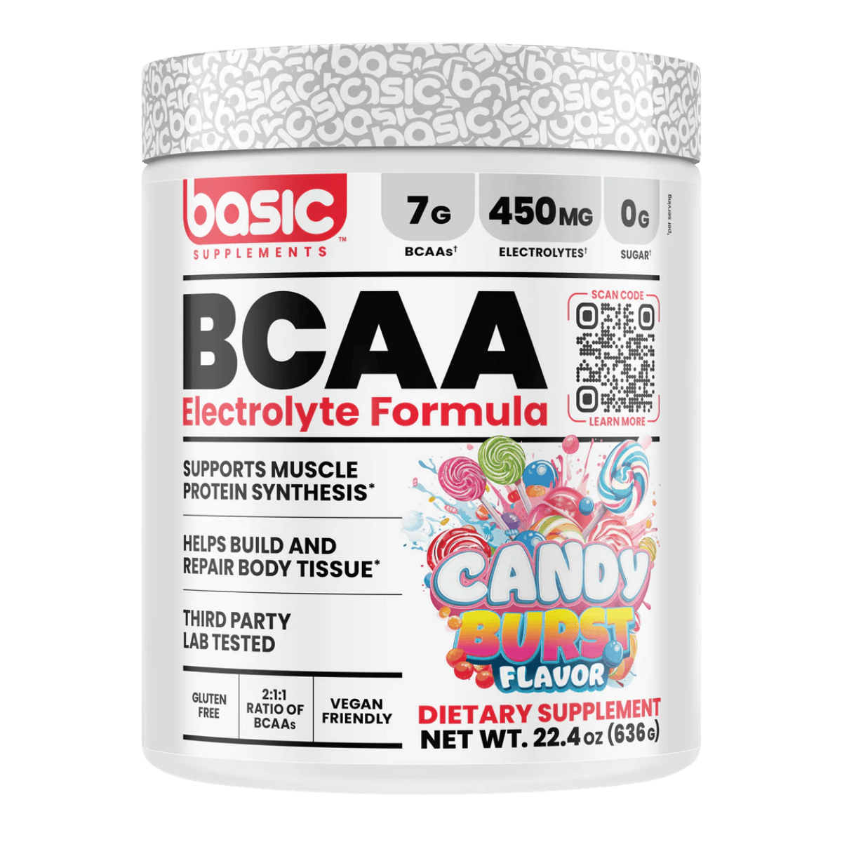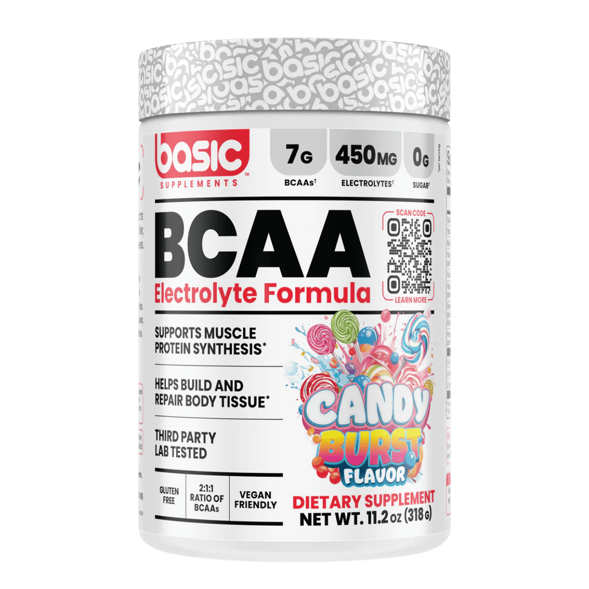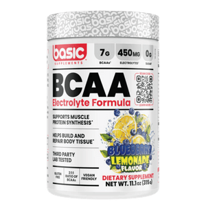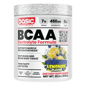 Basic Supplements BCAA is an instantized amino-acid drink mix designed to support workout performance, hydration, and recovery. Each serving delivers a 2:1:1 ratio of branched-chain amino acids (L-leucine, L-isoleucine, L-valine) to help support muscle protein synthesis and reduce exercise-related muscle breakdown. It also includes key electrolytes (sodium and potassium) plus B-vitamins to help replenish what you lose through training and support energy metabolism. This formula mixes easily and is made for use before, during, or after workouts—whether you train for strength, conditioning, or endurance. With zero sugar and a light, refreshing taste, it fits well into cutting phases, maintenance, or everyday training routines.