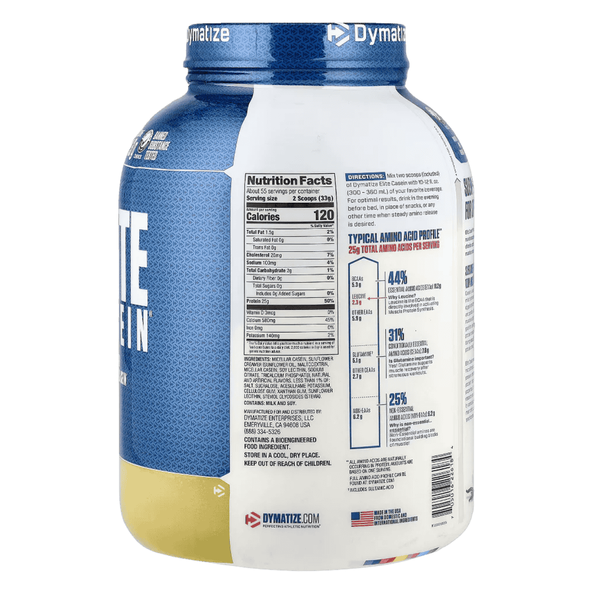 Dymatize Elite Casein is a slow-digesting micellar casein protein made to support muscle recovery and steady amino acid delivery over time. Each serving provides around 25 g of protein, making it a convenient way to boost daily protein intake for strength, performance, and lean muscle goals. Because micellar casein digests gradually, itβs a popular choice before bed or between meals when you want longer-lasting protein support. The formula mixes smooth and creamy in water or milk and works well in smoothies, oatmeal, yogurt bowls, and baking. Elite Casein is tested for banned substances for added peace of mind for competitive athletes. Flavour options vary, so the exact ingredients and nutrition facts can differ slightly by tub. Check the label of your chosen flavour for the most accurate allergen and ingredient details.