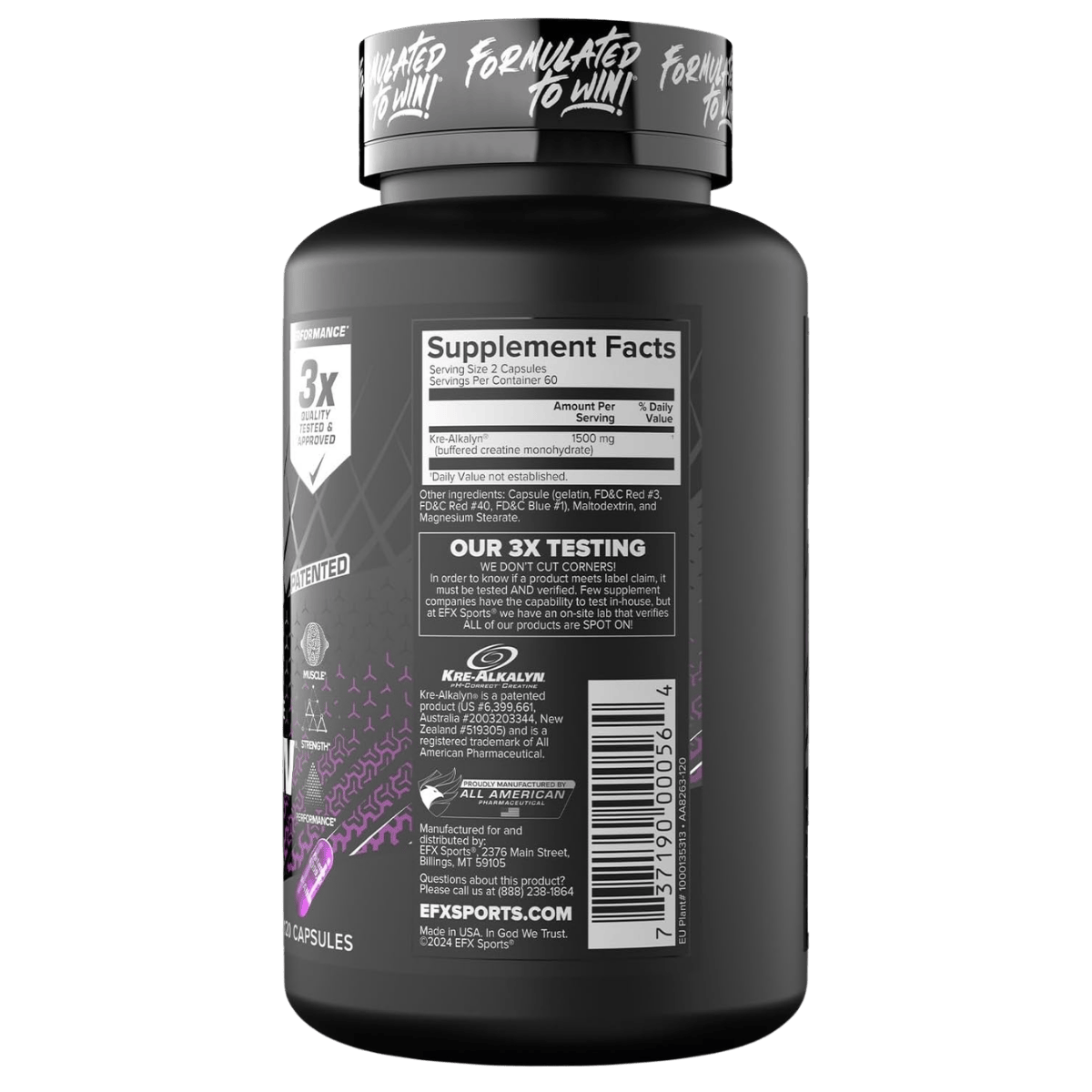 EFX Sports Kre-Alkalyn® EFX is a convenient buffered creatine monohydrate formula designed to support strength, power, and high-intensity performance without the hassle of measuring powders. Each serving provides 1,500 mg of Kre-Alkalyn in easy-to-take capsules, making it simple to stay consistent day to day. Creatine helps your muscles regenerate energy during short, intense efforts like lifting, sprinting, and interval training, which can support better training quality over time. This capsule format is ideal if you want no mixing and straightforward dosing at home or on the go. Kre-Alkalyn is made to be stable and is often chosen by athletes who want a “clean” creatine option as part of their performance stack. With regular use alongside training, it may help support increases in strength and improvements in repeated-bout performance. It’s a great fit for gym-goers focused on progressive overload, sport performance, and consistent output in tough sessions. If you want a simple creatine routine with capsule convenience, Kre-Alkalyn EFX is an easy add to your daily supplements.