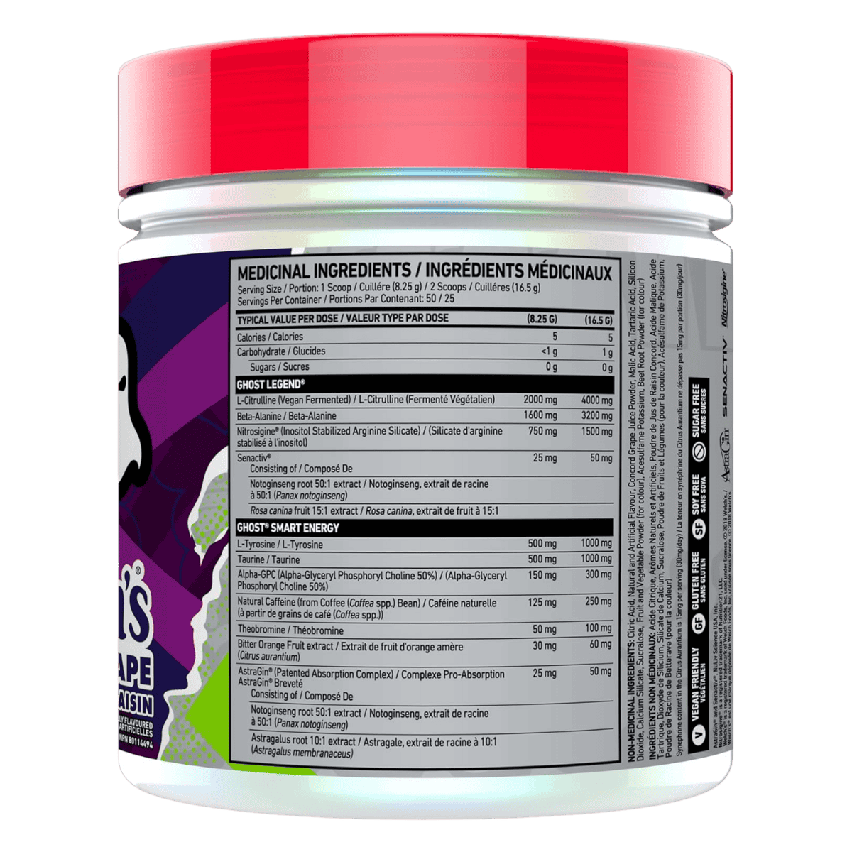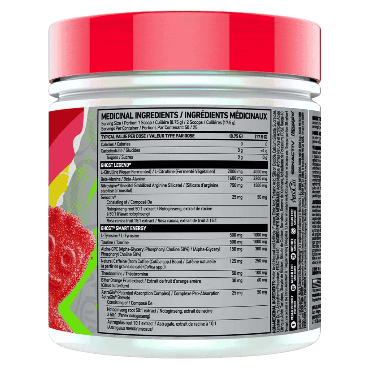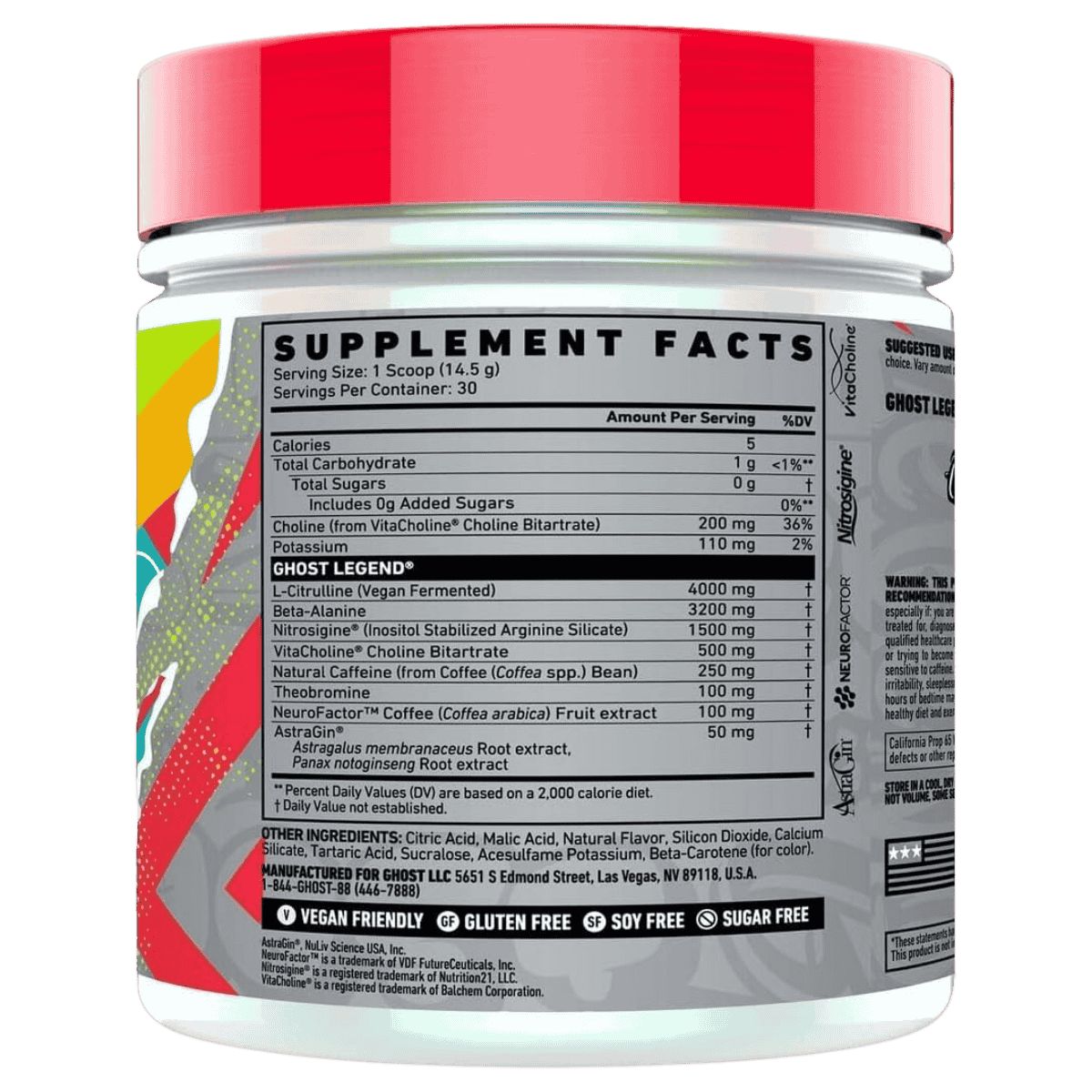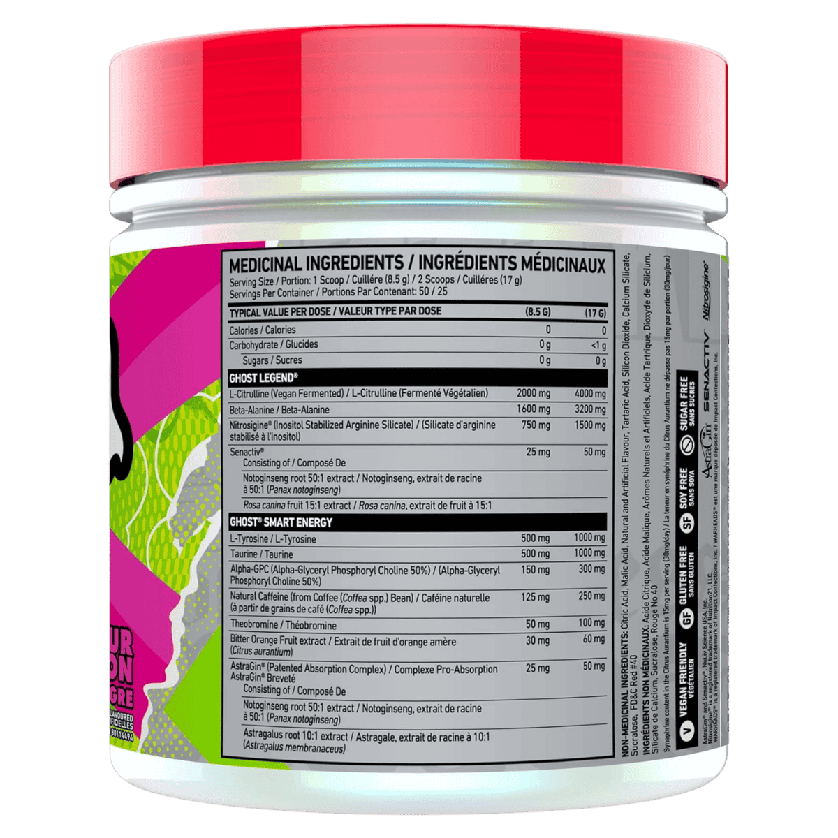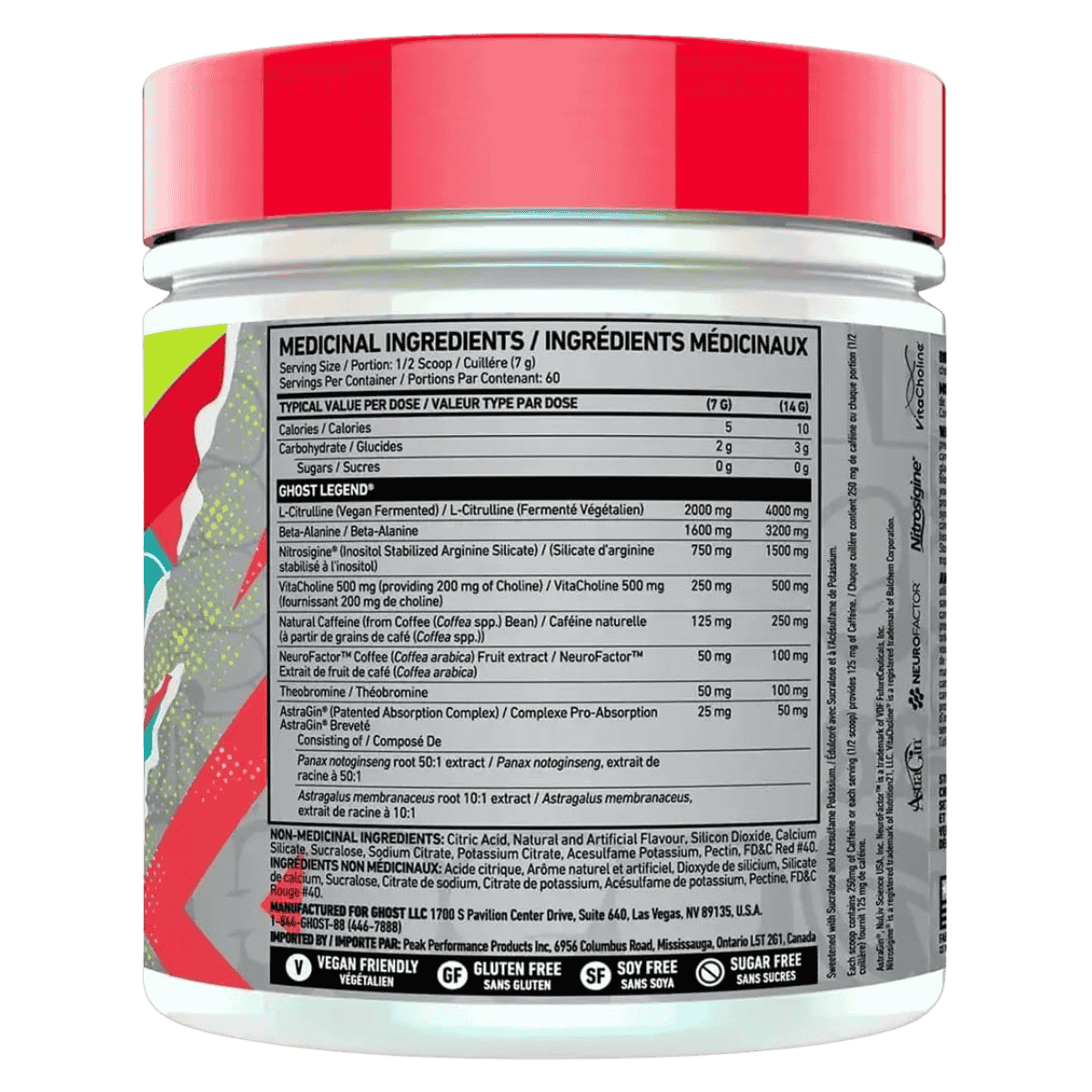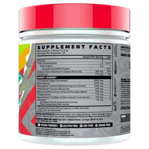 GHOST Legend Pre-Workout is a high-stim, performance-focused formula designed to support intense training sessions with noticeable energy, focus, and pump support. Each scoop delivers 4,000 mg L-citrulline plus Nitrosigine® (inositol-stabilized arginine silicate) to help promote blood flow and muscle pumps during workouts. You also get a full 3,200 mg dose of beta-alanine per scoop to support muscular endurance and help you push through high-rep sets. Taurine is included to support training performance and overall cellular function under stress. For mental drive, Legend features Alpha-GPC to support focus and mind-muscle connection when you need to lock in. The energy blend provides 125 mg caffeine per scoop (or 250 mg at two scoops), alongside theobromine and bitter orange extract for a more layered “kick” than caffeine alone. Vitamin C is included as antioxidant support to complement hard training blocks. It’s sugar-free and designed to mix easily, making it a solid choice for athletes who want a straightforward pre-workout they can use consistently. Various flavours are offered, so you can choose what you like without changing the core purpose: train harder and stay dialed in.