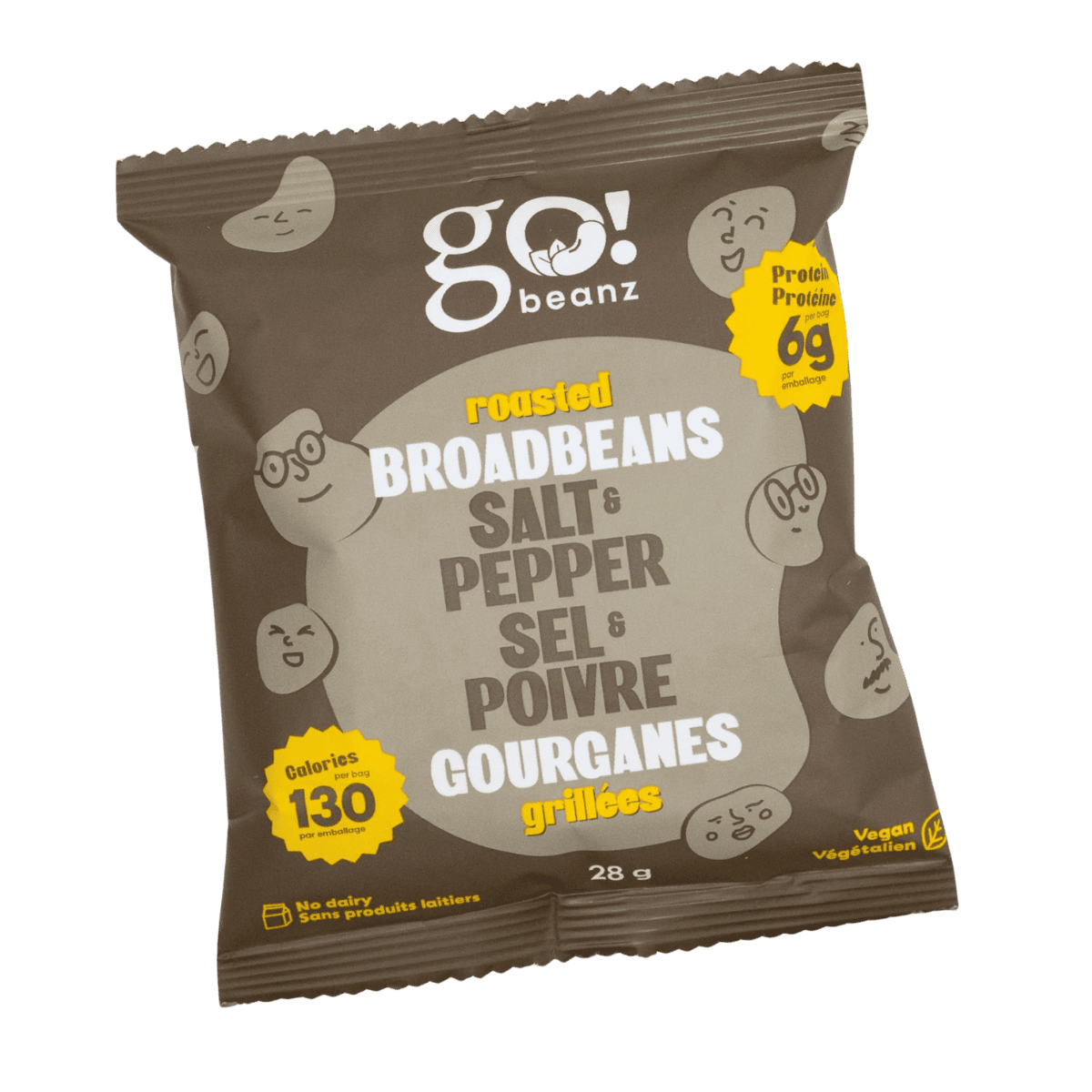 Go Nutrition Go Beanz Roasted Broad Beans are a crunchy, high-protein snack made from dry-roasted fava (broad) beans in a variety of bold, chip-inspired flavours. Each 28 g bag provides around 6 g of plant-based protein with 130 calories or less, offering a satisfying alternative to traditional chips. The beans are oven-baked, not fried, and made without palm oil, delivering a lighter crunch with less sodium and better nutrition than many conventional snacks. Go Beanz are produced in Canada and designed for on-the-go snacking at work, school, the gym or on the road. With flavours like Sea Salt & Vinegar, BBQ Chipotle, Salt & Pepper, Sour Cream & Onion, Ketchup and Honey & Mustard, they fit perfectly into a healthy, active lifestyle.