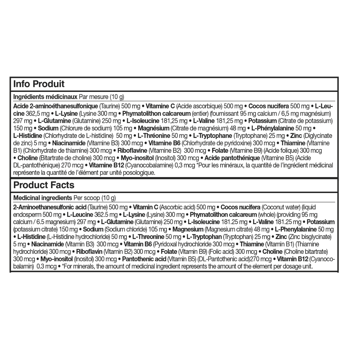 Adults (18+): Stir 1 serving into 400–500 mL of water (or juice) and drink immediately once daily; hydrate before, during, and after exercise; allow several hours between taking other natural health products or medications.