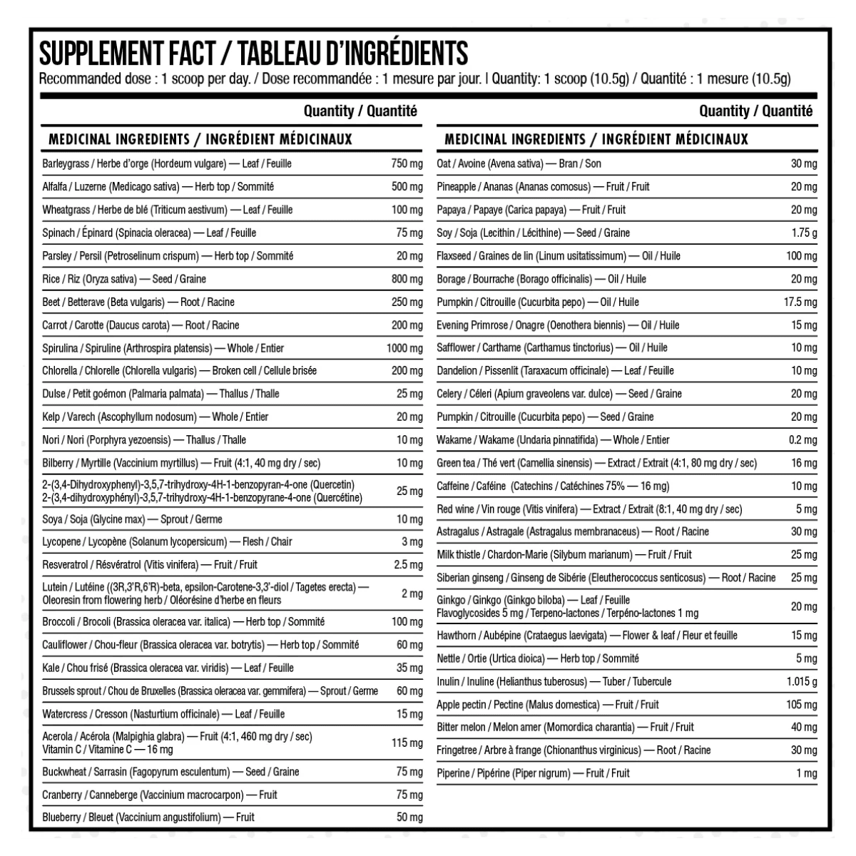 - Contains a variety of greens and algae (e.g., spirulina, chlorella) for nutrient density