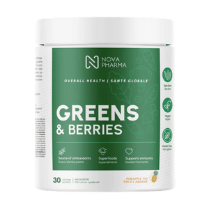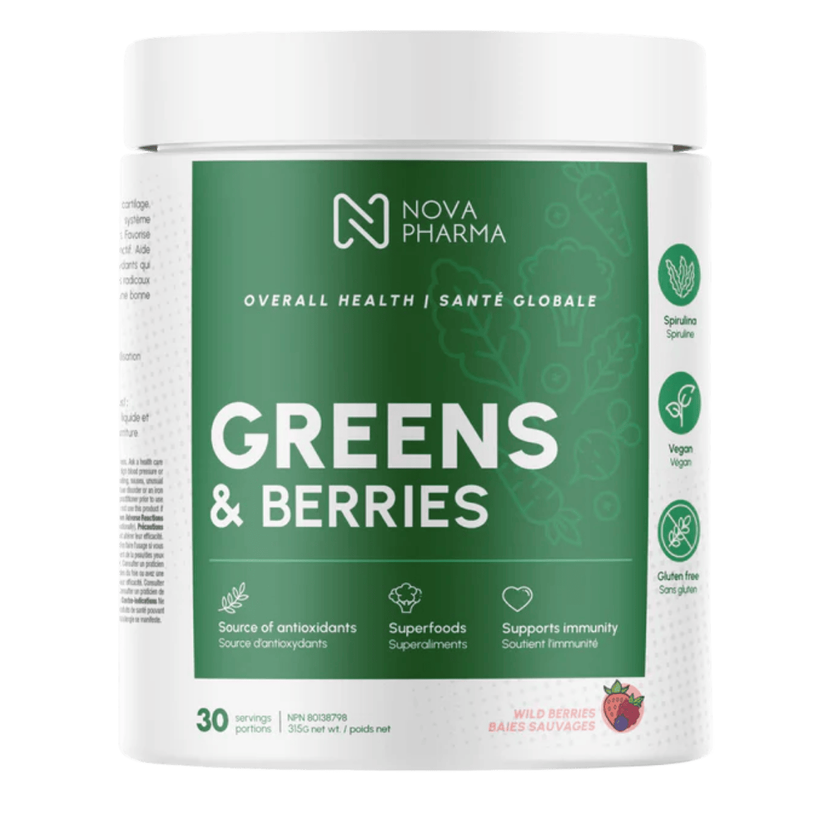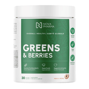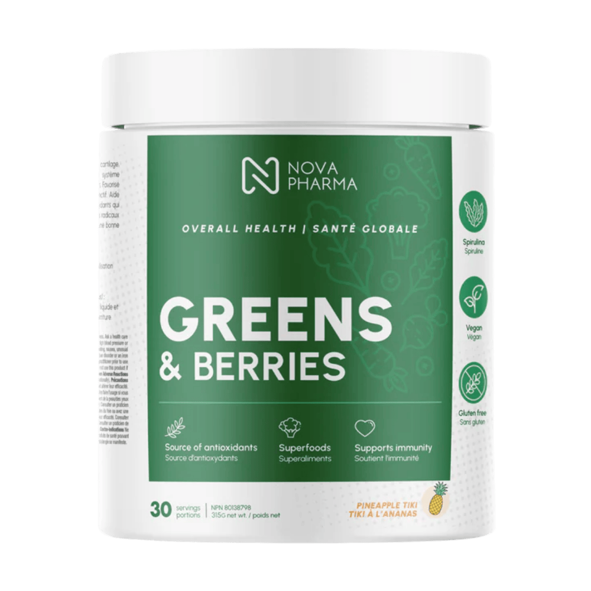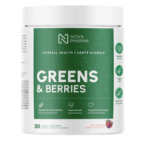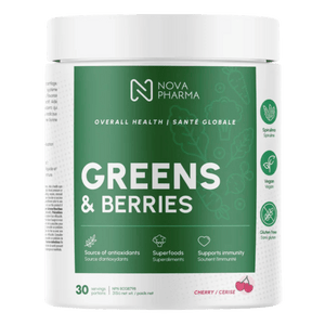 Nova Pharma Greens & Berries is a daily greens + superfoods powder that makes it easy to add more plant-based nutrition to your routine with one simple scoop. Built around a wide variety of greens, fruits, botanicals, and algae, it delivers a broad spectrum of naturally occurring phytonutrients and antioxidants to support everyday wellness. Key ingredients like barleygrass, spirulina, chlorella, and spinach help round out your daily intake of nutrient-dense greens. This formula also includes inulin and apple pectin, two well-known prebiotic fibers that support a healthy gut environment and digestive comfort. With a blend of functional botanical extracts such as green tea, astragalus, milk thistle, and ginkgo, it’s designed for all-around vitality and balance. Acerola-derived vitamin C adds antioxidant support, while lecithin helps support mixability and provides naturally occurring phospholipids. Each serving contains a small amount of caffeine (10 mg), offering gentle support for daily energy without feeling overly stimulating. Mix it into water, smoothies, or your favourite cold beverage for a convenient wellness ritual you can keep up with.