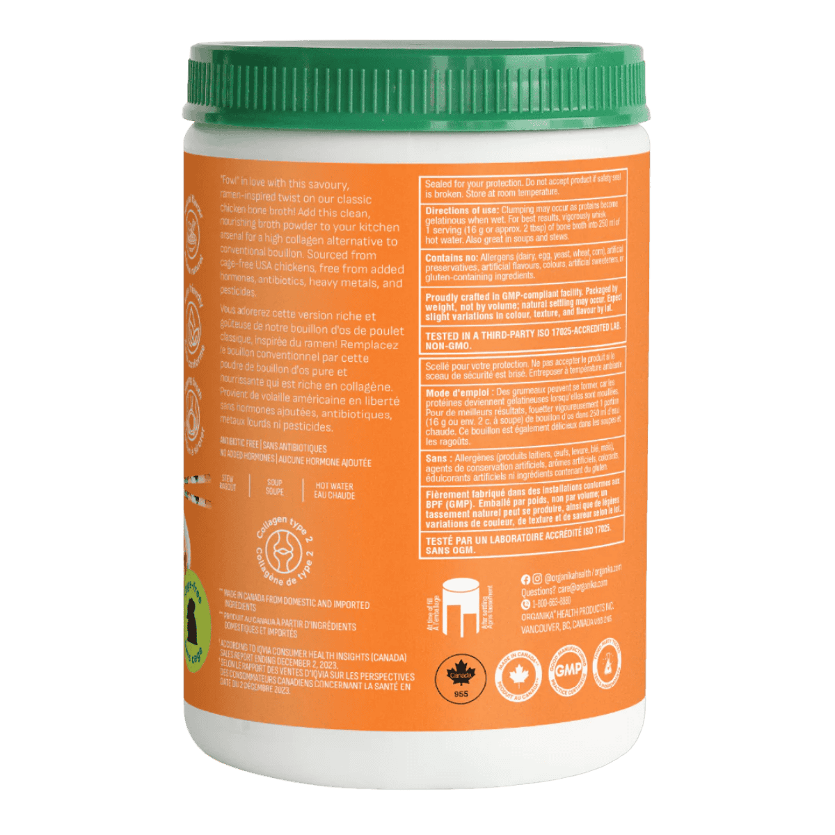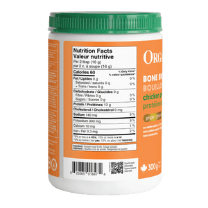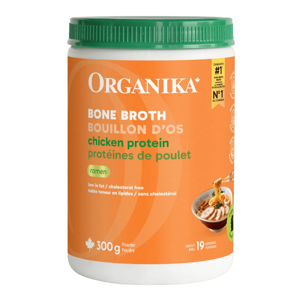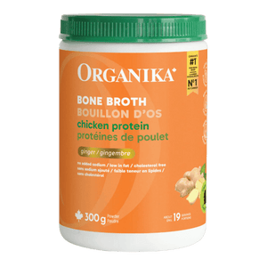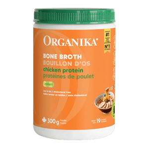 Organika Chicken Bone Broth Protein Powder is a convenient, savoury protein + collagen boost made from real chicken bone broth—no long simmering required. Each serving delivers 15 g of protein with 0 g sugar and 0 g carbs, making it an easy fit for many nutrition styles. The naturally occurring collagen and gelatin in bone broth are commonly used to support joint comfort, skin resilience, and gut lining support. It also provides key minerals like potassium, plus small amounts of calcium and iron. This product works great as a warm sipping broth or as a functional add-in for soups, stews, and recipes that need a savoury lift. Since you’ll be using flavours as variants, note that the base is chicken bone broth, with some flavours adding ginger or turmeric + black pepper for extra taste. Clean and simple, it’s an easy daily option for anyone wanting a warm, protein-forward alternative to typical powders.