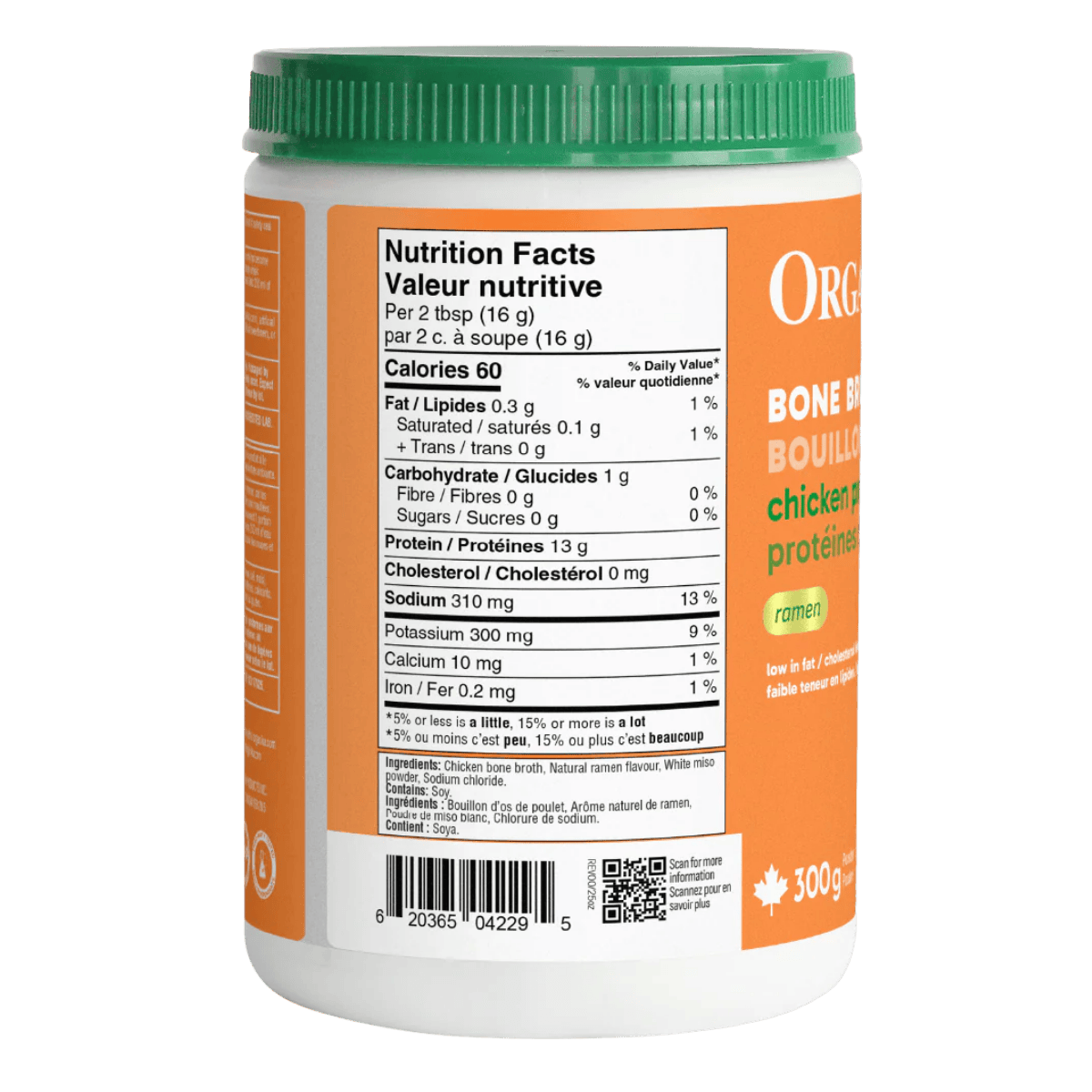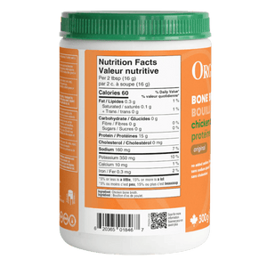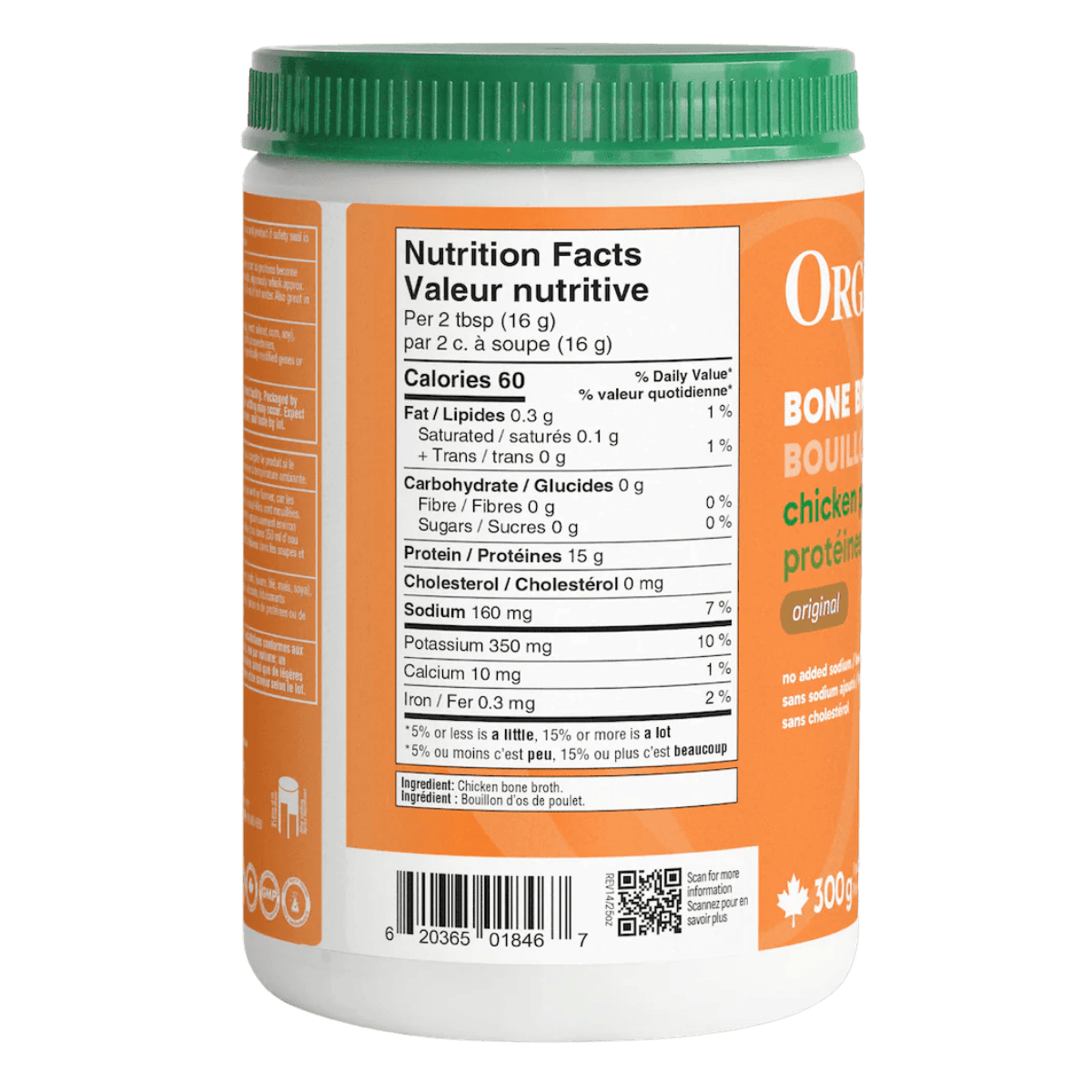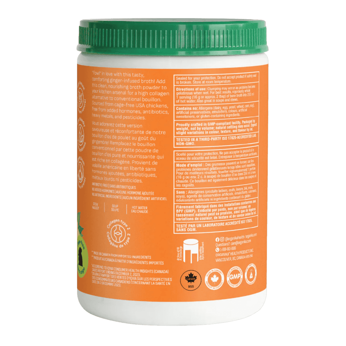 Organika Chicken Bone Broth Protein Powder is a convenient, savoury protein + collagen boost made from real chicken bone broth—no long simmering required. Each serving delivers 15 g of protein with 0 g sugar and 0 g carbs, making it an easy fit for many nutrition styles. The naturally occurring collagen and gelatin in bone broth are commonly used to support joint comfort, skin resilience, and gut lining support. It also provides key minerals like potassium, plus small amounts of calcium and iron. This product works great as a warm sipping broth or as a functional add-in for soups, stews, and recipes that need a savoury lift. Since you’ll be using flavours as variants, note that the base is chicken bone broth, with some flavours adding ginger or turmeric + black pepper for extra taste. Clean and simple, it’s an easy daily option for anyone wanting a warm, protein-forward alternative to typical powders.