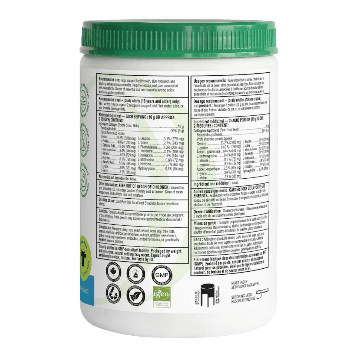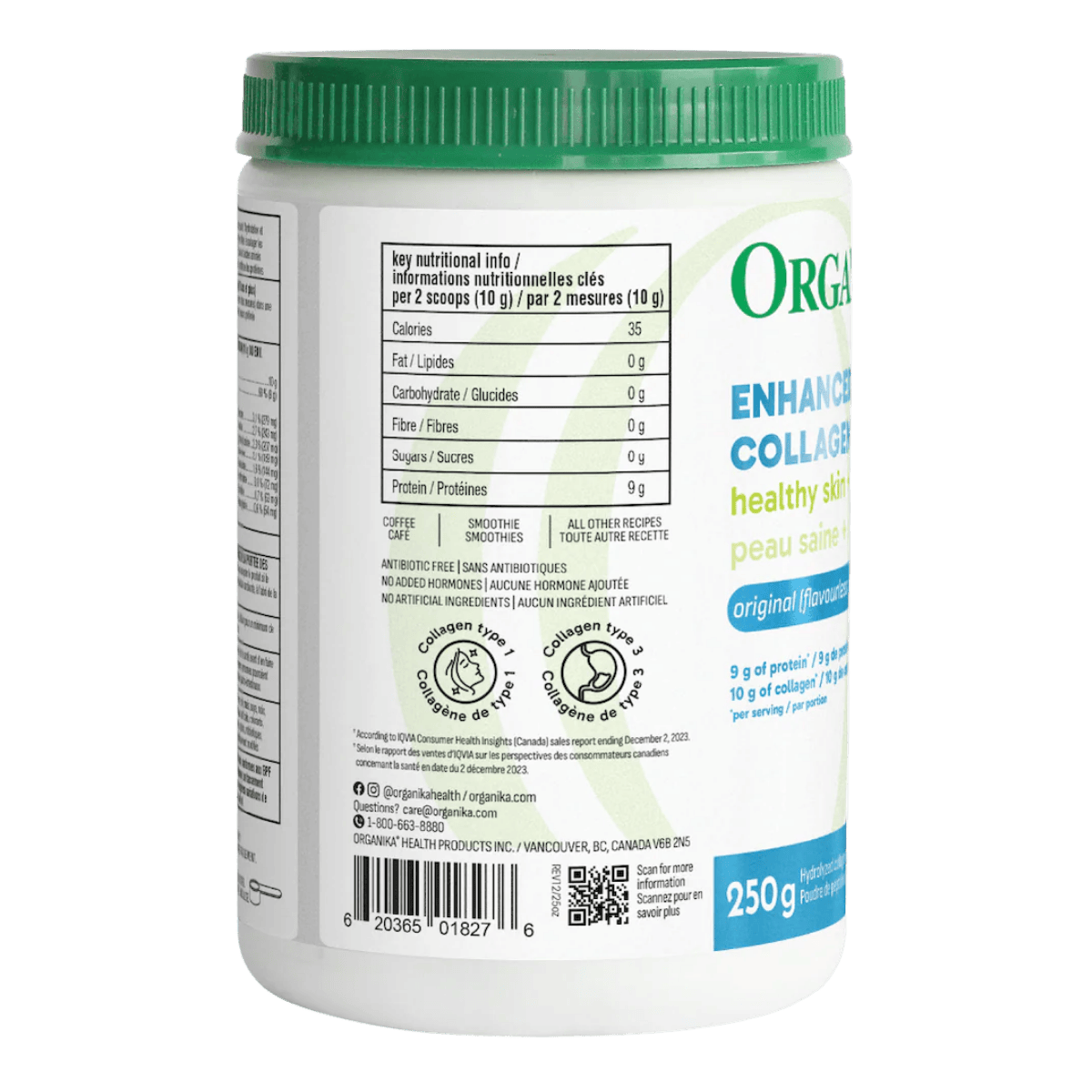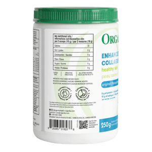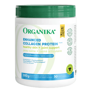 Organika Enhanced Collagen Original is a single-ingredient collagen peptide powder designed to support healthy skin, hair, nails, joints, and gut. Made with hydrolyzed bovine collagen peptides, it mixes easily into hot or cold drinks without altering flavour, making it simple to add to smoothies, coffee, tea, or recipes. Each serving provides 9g of protein and naturally occurring amino acids, including glycine, proline, and lysine, which are important for connective tissue structure and collagen formation. Taken daily, it may help reduce joint pain associated with osteoarthritis and support overall joint comfort. Collagen peptides can also support the appearance and elasticity of skin and help maintain healthy aging-related connective tissue. This clean formula is made with no added fillers and fits well into both wellness and performance-focused routines.
