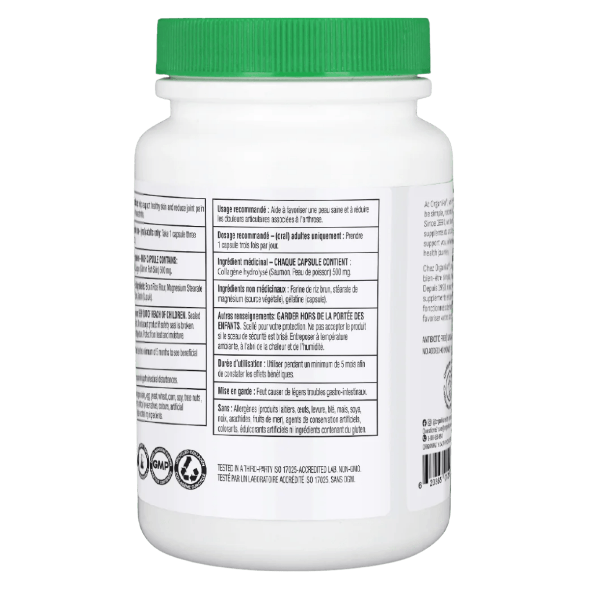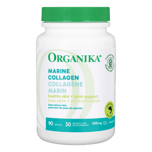 Organika Marine Collagen Capsules provide 500 mg of hydrolyzed salmon collagen per capsule in a convenient, no-mix format. This marine-based collagen is commonly used to support skin elasticity, hair and nail strength, and overall connective tissue health. Each daily serving (3 capsules) delivers 1,500 mg of protein, making it an easy add-on to a wellness routine. Marine collagen is often chosen as an ocean-sourced alternative to bovine collagen while still providing key amino acids that support collagen-building in the body. With consistent use, many people take collagen to help maintain joint comfort and mobility over time. This formula is straightforward and uses a short ingredient list, with collagen as the primary medicinal ingredient. Best suited for adults looking for daily collagen support in capsule form.