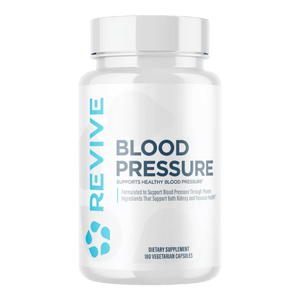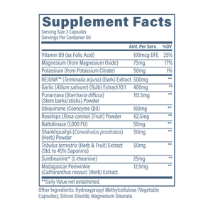 Revive Blood Pressure Support is a comprehensive cardiovascular formula designed to help support healthy blood pressure levels already within a normal range, along with circulation and vascular function. It combines foundational nutrients like magnesium, potassium, and folate (Vitamin B9) to support electrolyte balance and overall heart health. The formula features targeted botanicals including REJUNA™ (Terminalia arjuna) and garlic extract to help promote healthy blood flow and cardiovascular support. It also includes CoQ10 for cellular energy and antioxidant support, plus traditional herbs like punarnava, shankhpushpi, and rosehips to round out the blend. For additional circulatory support, it provides nattokinase, and it adds Suntheanine® (L-theanine) to complement stress-related cardiovascular balance. This product is vegan-friendly and made with a well-rounded ingredient profile for everyday heart and vascular wellness support.