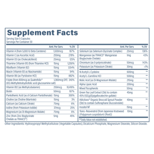 Revive MD Multi Vitamin is a comprehensive daily multivitamin designed to help fill common nutrient gaps and support overall wellness for men and women. Each serving provides key vitamins and minerals including Vitamin C, Vitamin D3, methylcobalamin (B12), Quatrefolic® folate, and chelated minerals like TRAACS® zinc to support foundational nutrition. The formula goes beyond a basic multi by including targeted antioxidant and cellular-support ingredients like N-acetyl-L-cysteine (NAC) and alpha lipoic acid. It also features acetyl L-carnitine HCl to support cellular energy pathways and everyday vitality. For additional phytonutrient support, it includes green tea extract, HiActives® organic broccoli sprout powder, and trans-resveratrol. This blend is well-suited for people looking for daily immune and energy support alongside broader wellness coverage. Multi Vitamin is produced in a GMP facility and is third-party tested for quality.