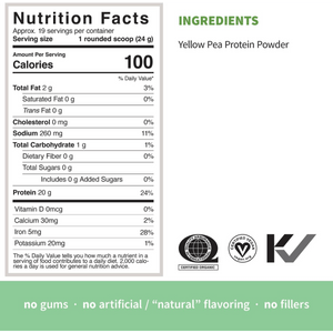 Sprout Living Simple Protein Organic Pea is a clean, single-ingredient pea protein made from organic yellow peas. Each scoop delivers 20 g of plant-based protein with a smooth, mild taste that blends easily into smoothies, shakes, oatmeal, and recipes. With no gums, flavouring, fillers, or additives, it’s a simple option for anyone avoiding dairy-based proteins. Ideal for daily protein support and post-workout routines, it helps you meet your protein goals with minimal ingredients.