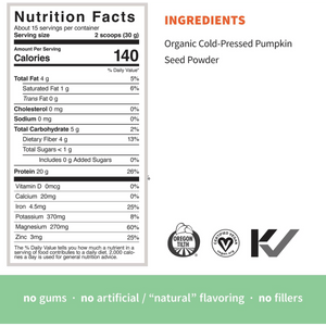 Sprout Living Simple Protein Organic Pumpkin is a single-ingredient, organic pumpkin seed protein powder made from cold-pressed pumpkin seeds. It provides a clean plant-based protein option with a naturally mild, slightly nutty taste that blends well into smoothies and recipes. Each serving delivers 20 g of protein with no added sugars, and the formula contains no gums, thickeners, preservatives, or flavouring additives. This product is positioned as a hypoallergenic, minimal-ingredient protein for daily nutrition and post-workout routines.
