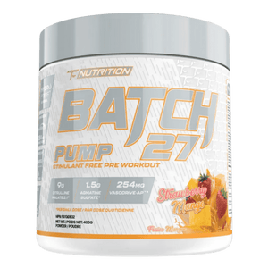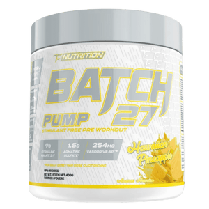 TC Nutrition Batch 27 Pump (Stim-Free) is a caffeine-free pre-workout designed to support intense training without stimulants, making it a great option for late workouts or stacking with other products. It features L-Citrulline (from Citrulline Malate) to support nitric oxide production and muscle “pump,” plus Betaine Anhydrous to help support training performance and power output. Agmatine and maritime pine bark extract add targeted blood-flow and vascular support, while piperine helps support ingredient absorption. For hydration and workout feel, glycerol and sodium chloride (from pink Himalayan salt) support fluid balance and performance. This formula is also beta-alanine free, so you can train without the tingles. Note: it contains milk by-products (casein).