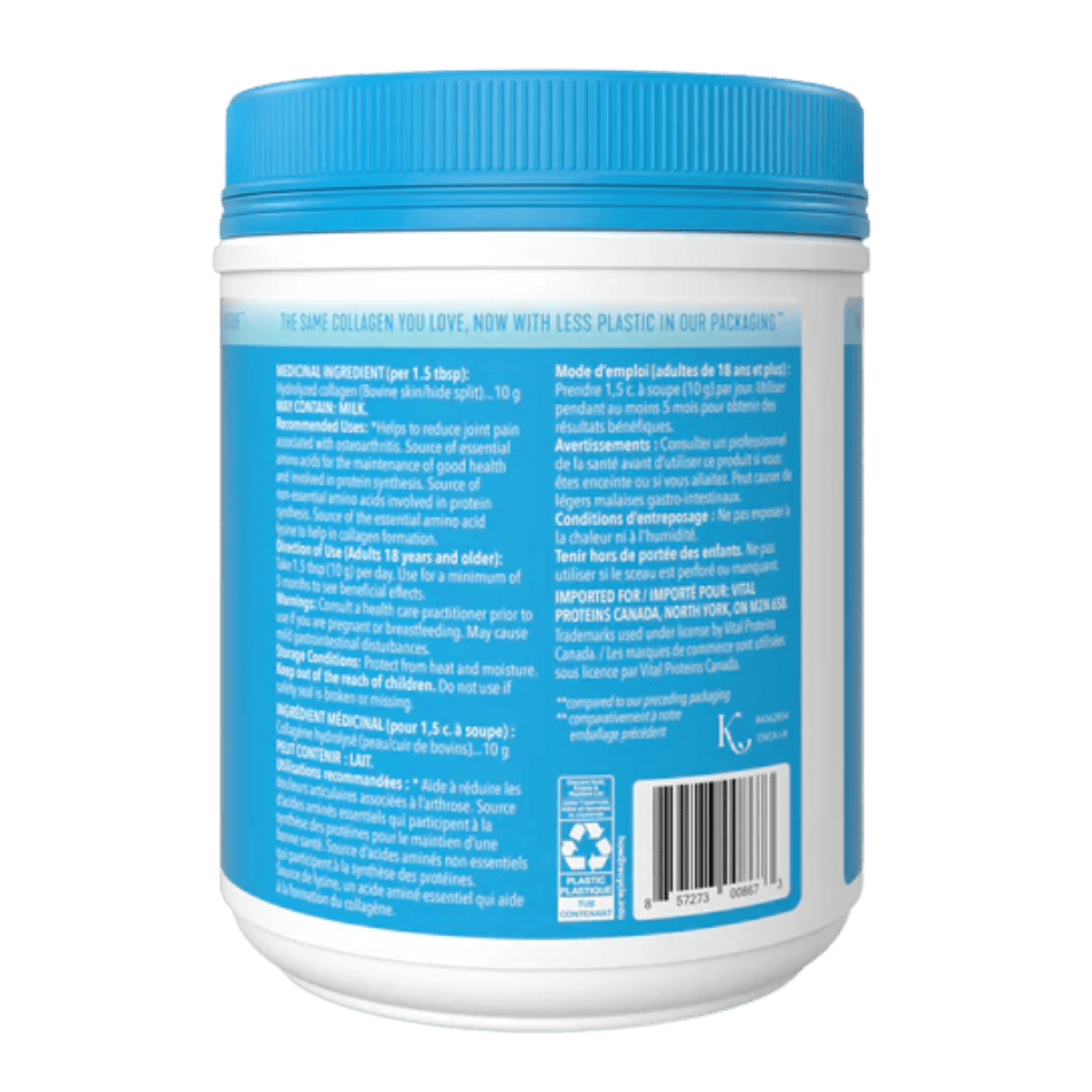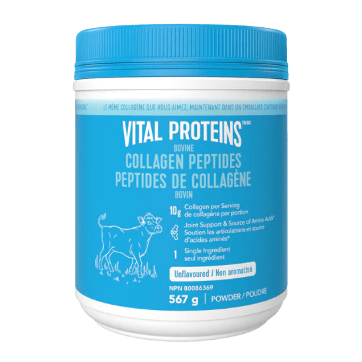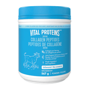 Vital Proteins Bovine Collagen Peptides is a hydrolyzed collagen powder made from pasture-raised, grass-fed bovine hide for easy mixing and digestion. Collagen is a key structural protein found in connective tissues, and supplementing can help support the body’s collagen formation as we age. This unflavoured powder dissolves easily in hot or cold liquids, making it simple to add to coffee, smoothies, water, or recipes without changing taste. It provides a source of amino acids and can help support joint comfort, including helping to reduce joint pain associated with osteoarthritis (as per product claims). It also supports overall wellness by contributing to protein intake and connective tissue support. With no added sugar and a neutral taste, it fits into many nutrition styles and daily routines. A single daily serving is all that’s typically needed to get started.